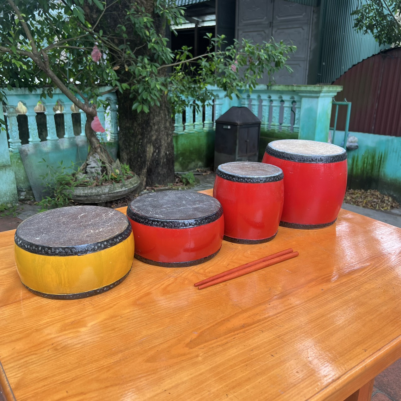 👉 Trống cúng thường được đặt trên bàn thờ hoặc dùng kèm chuông mõ.
