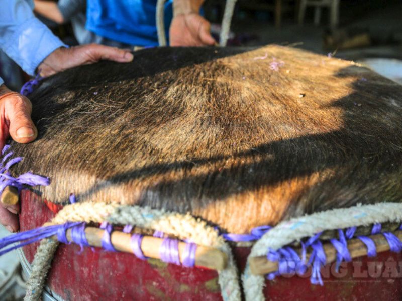 Da được xử lý, phơi khô tự nhiên rồi căng thẳng đều lên mặt trống và đóng chặt bằng gỗ hoặc sắt.